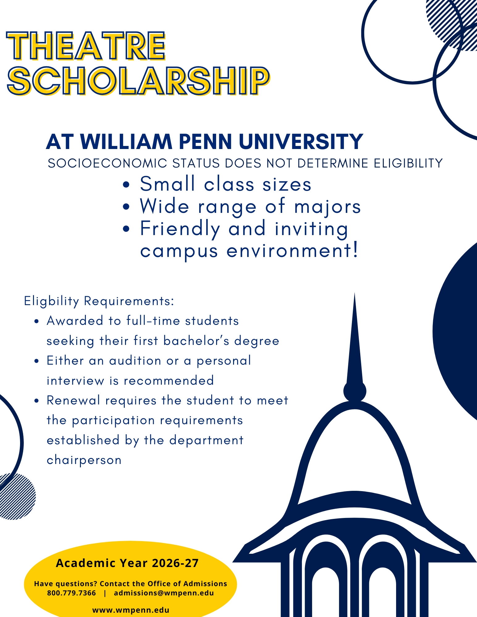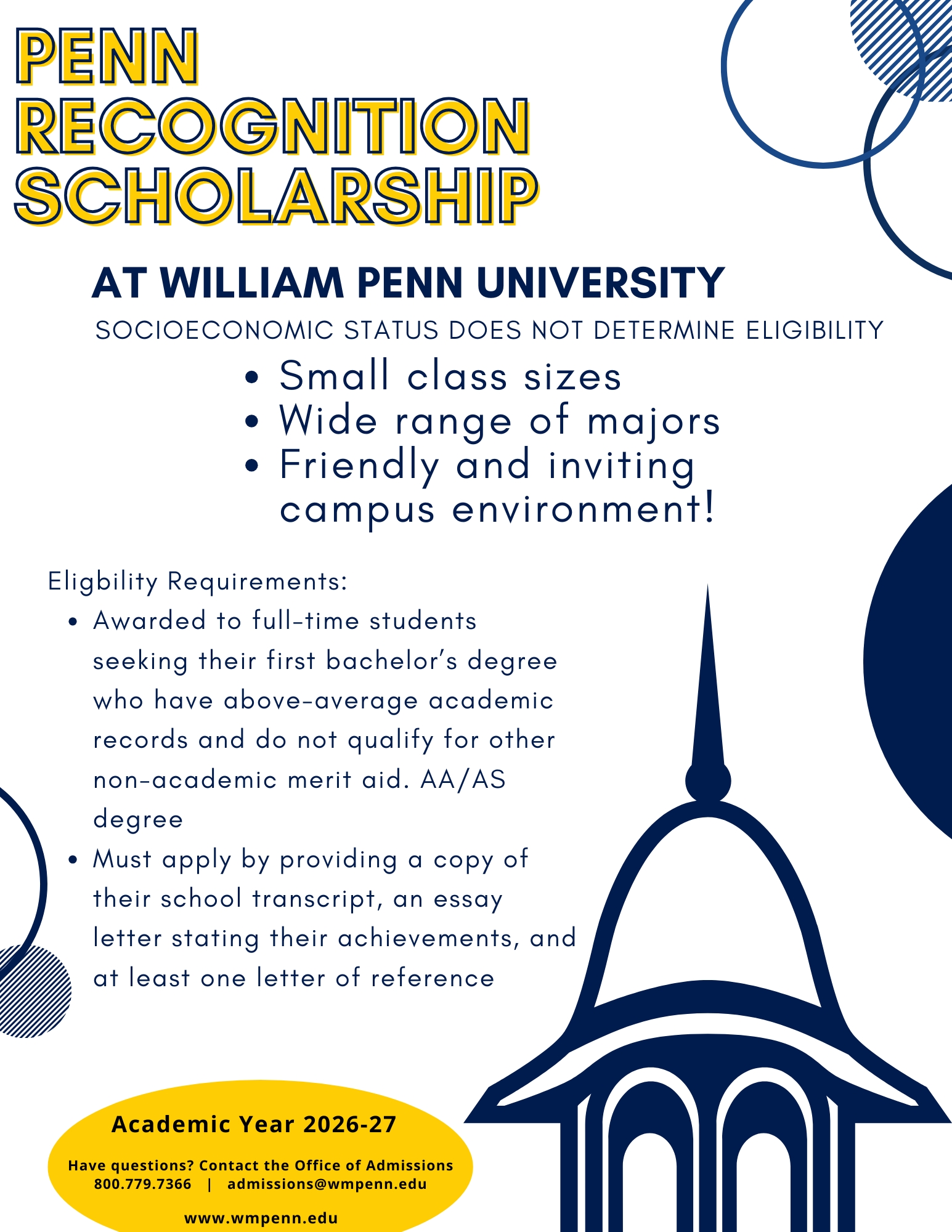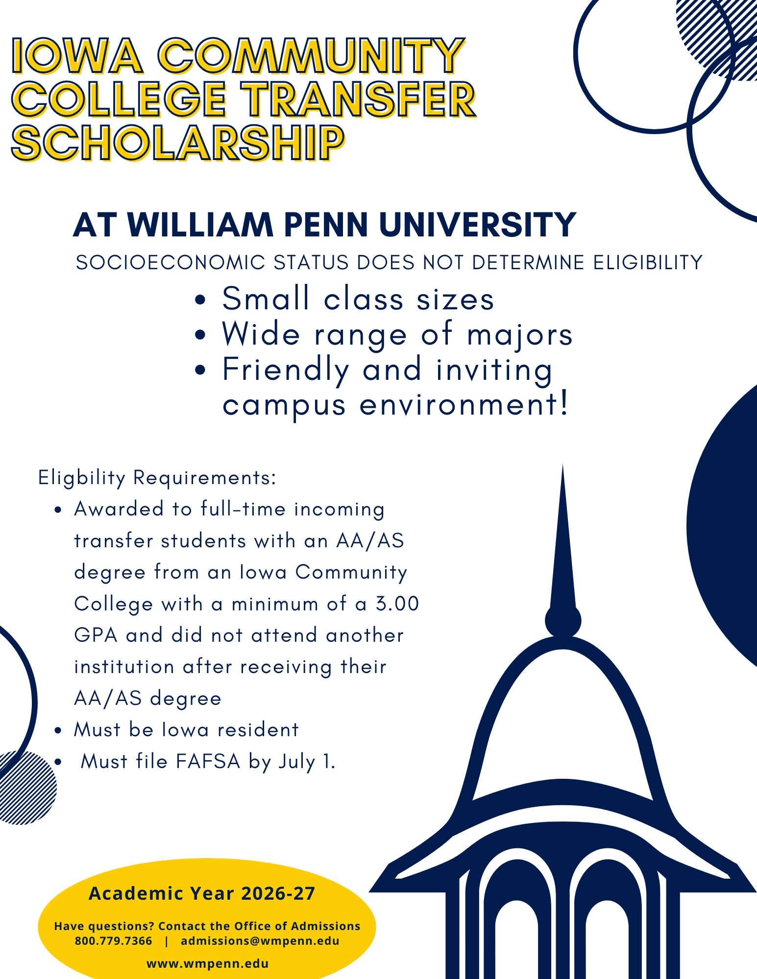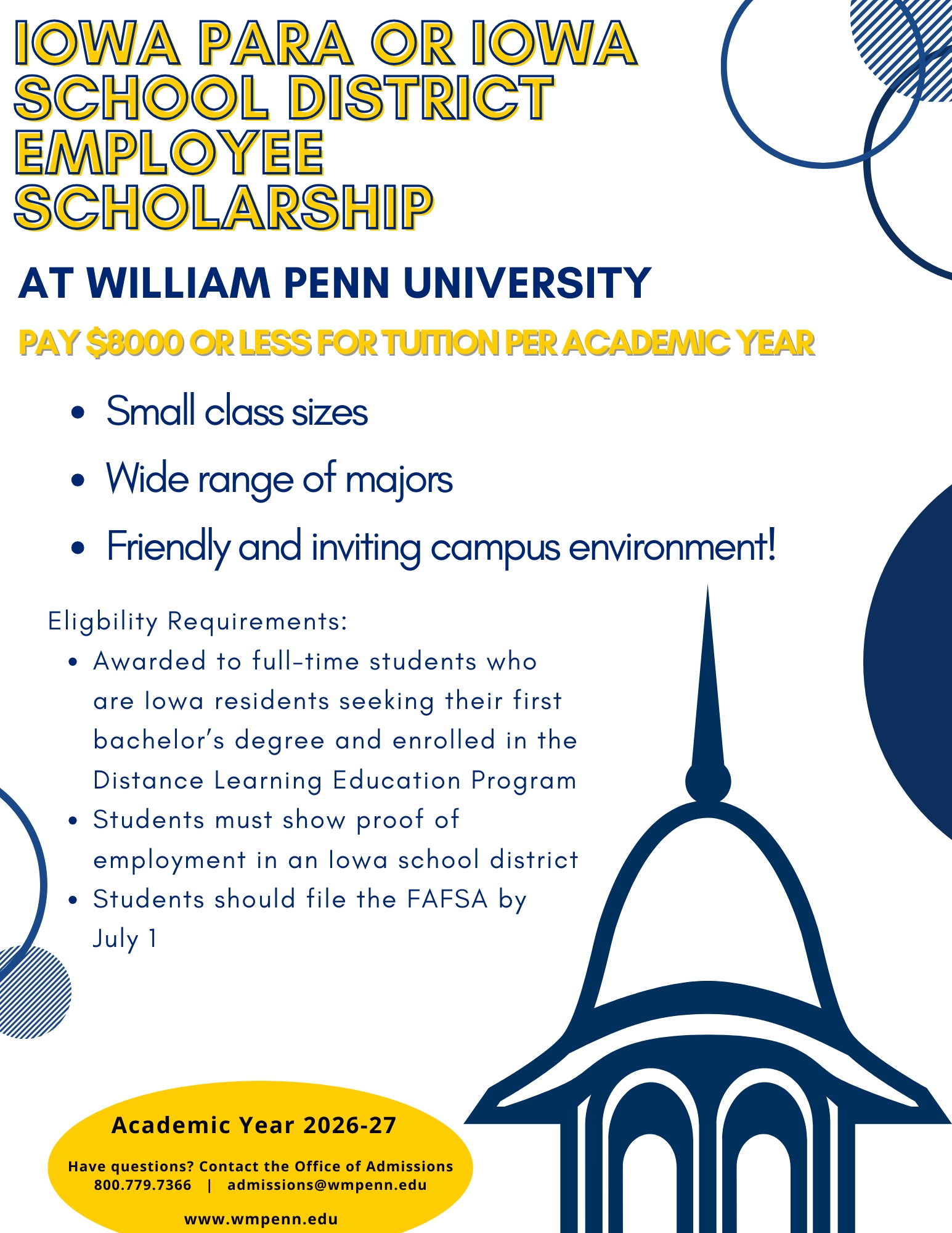 At William Penn University, we are committed to supporting students by providing institutionally funded scholarships for full-time undergraduates enrolled on our traditional campus or in our Distance Learning Educational Program. This reflects our founding mission to make quality higher education accessible to all motivated and capable individuals.