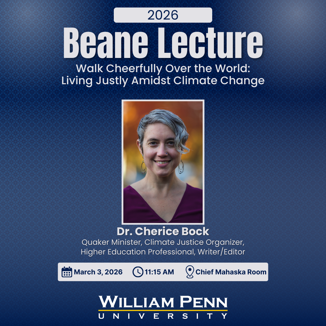William Penn University welcomes Dr. Cherice Bock as this year’s Beane Lecturer for her talk, “Walk Cheerfully Over the World”: Living Justly Amidst Climate Change. As the past 11 years have been the warmest on record, communities worldwide are experiencing more frequent and severe climate impacts that disproportionately affect the most vulnerable. Drawing on George Fox’s call to “walk cheerfully over the world,” Dr. Bock will examine how faith traditions, including the Quaker movement, both inspire care for creation and reflect complicity in systems that exploit people and the land. This lecture invites reflection on the Spirit-led and justice-based roles individuals and communities can play in responding to climate change and working toward a just and sustainable future.