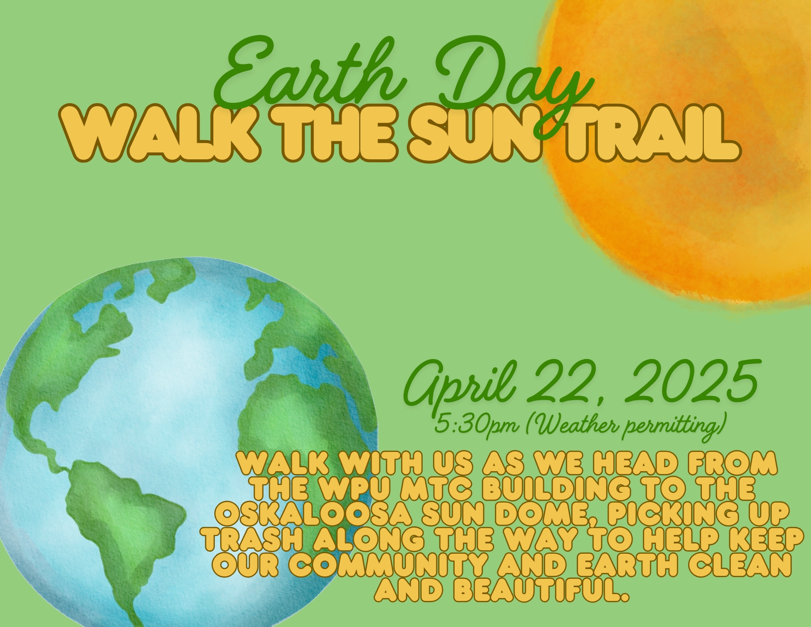Celebrate Earth Day with purpose and community by joining us for Walk the Sun Trail—a scenic and meaningful walk from William Penn University’s MTC Building to the Oskaloosa Sun Dome. This event is a chance to enjoy the beauty of the outdoors, connect with fellow students and community members, and reflect on our shared responsibility to care for the planet.